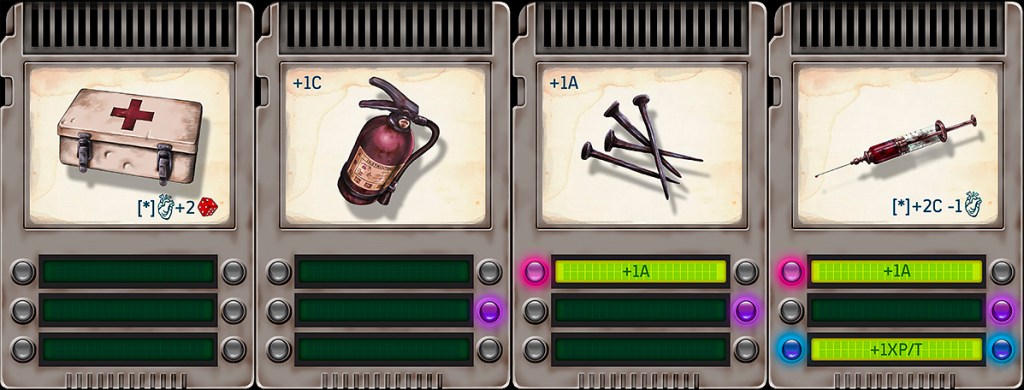 All items can be combined, linking their item cards in the main character sheet, with up to four available spaces. When characters combine items, they can create new and powerful gadgets. These new gadgets can be used as weapons, as defensive objects or can be used to interact with the environment in new creative ways.