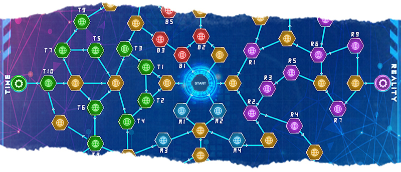 The quantum abilities of the characters are managed by the dimensional bar. Channeling this energy towards the characters reality (blue), they get some special skills related with science and control. But if they go to the opposite direction, and play with unknown energies from the new dimension (red), they can get completely different skills.